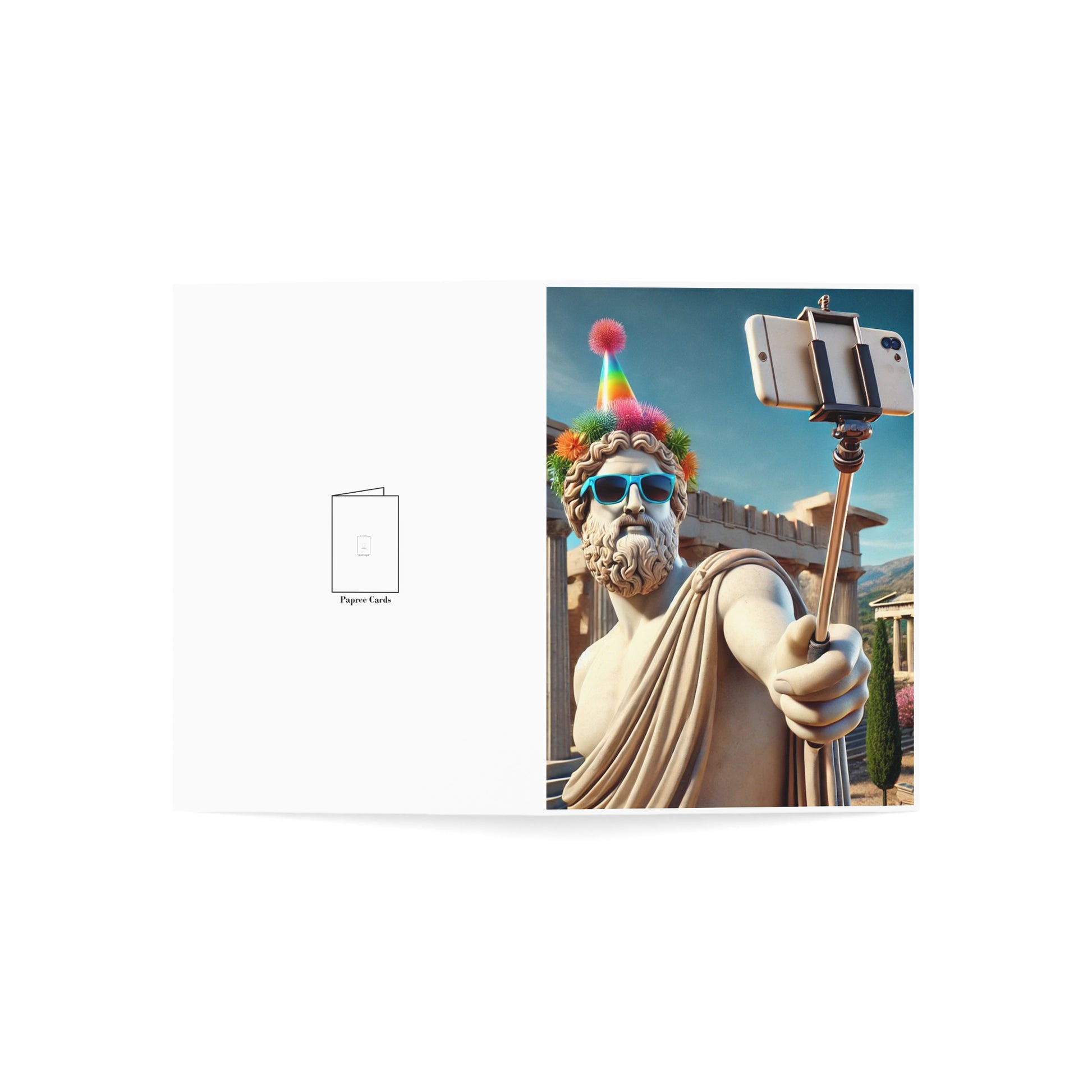 Add a touch of classical humor to your birthday wishes with this unique card featuring a hyperrealistic ancient Greek statue embracing modern technology. The striking image shows a dignified marble statue holding a selfie stick, complete with sunglasses and a party hat - creating a perfect blend of classical art and contemporary culture. The inside message reads: 'Hope your birthday is one for the history books! Stay classic.'